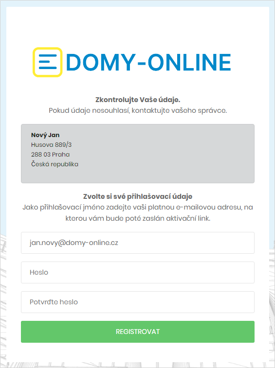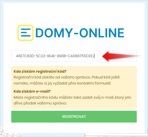 Od svého správce jste obdrželi registrační kód, který slouží k registaci na portál Domy-online. V procesu registrace, který si nyní popíšeme, si zadáte svůj přihlašovací e-mail a heslo.