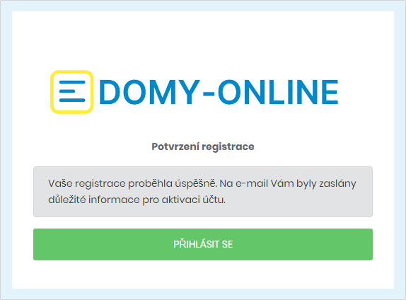 Po stisku tlačítka REGISTROVAT se na zadaný e-mail odešle ověřovací mail s aktivačním tlačítkem. V ověřovacím e-mailu je třeba kliknout na aktivační odkaz. Tím se váš e-mail ověří a účet na Domy-online bude plně funkční.