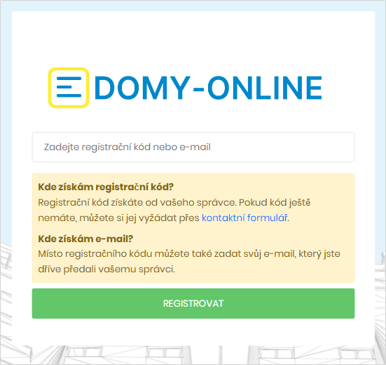Registrovat se může každý uživatel, který má již od svého správce zavedený e-mail uživatele nebo obdržel registrační kód. V opačném případě kontaktujte svého správce a vyžádejte si u něj přístup na Domy-online.